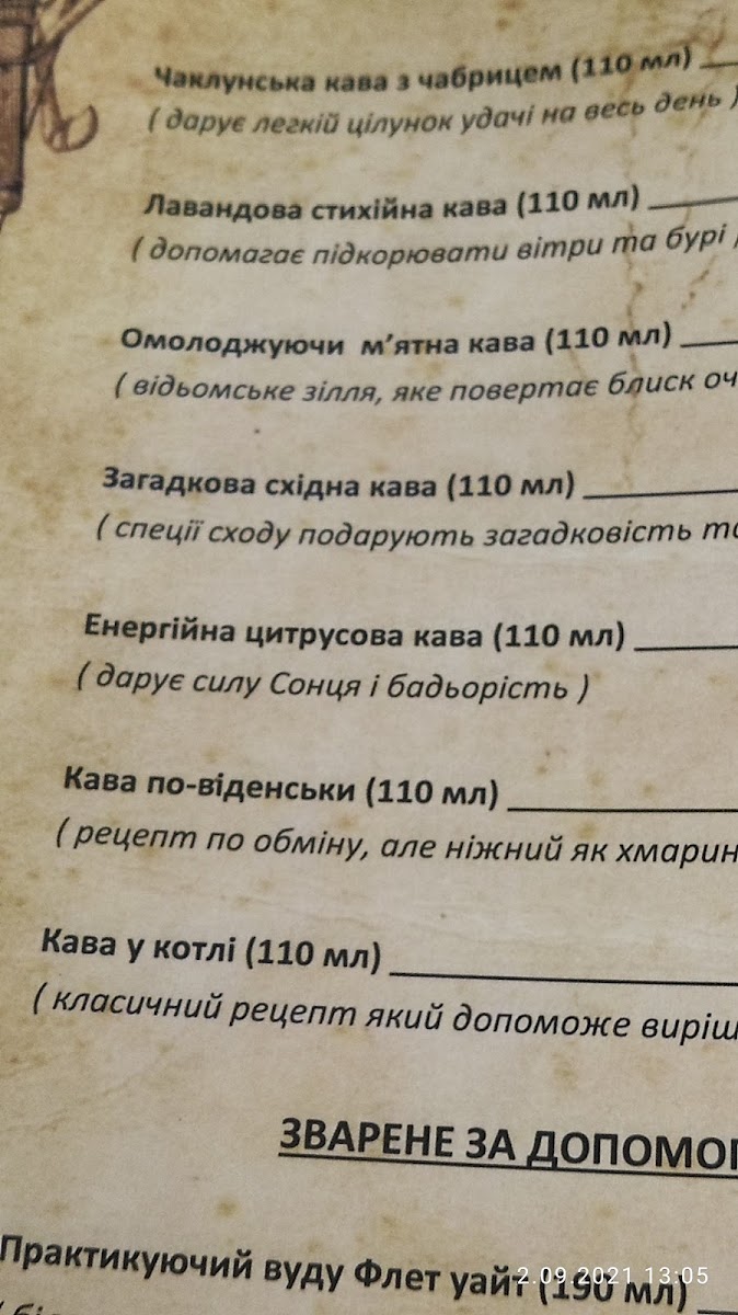 Welcome to Kav'yarnya 'Vidʹmatsʹka Kava', a charming café nestled on P'yatnyts'ka St in Chernihiv. This enchanting spot specializes in unique coffee concoctions that promise not just flavor, but an experience steeped in a blend of science and magic. The menu showcases delightful offerings like Chaklun's Coffee with Thyme, which gifts a gentle kiss of luck, and the V60 Filter Coffee, crafted through a secret alchemical ritual to reveal the essence of each bean.